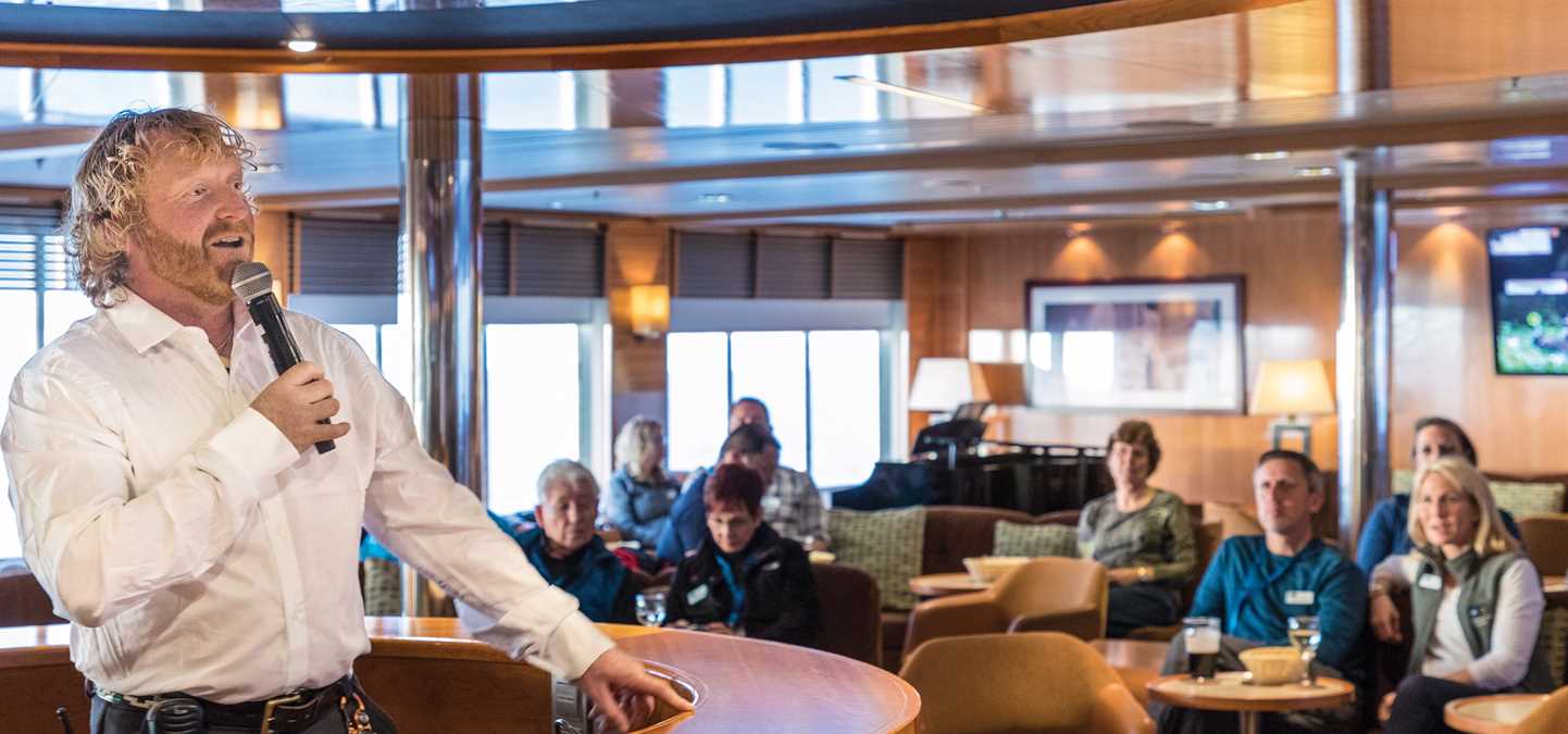 In most cases, the guest speaker will join the full expedition, sharing meals, venturing out to explore, and participating in every aspect of the journey. Sometimes, when the guest speaker is actively involved in world affairs—an acting ambassador or scientist in the middle of complex fieldwork—they will come aboard simply to share a day or lead a talk and then answer questions at the day’s end.