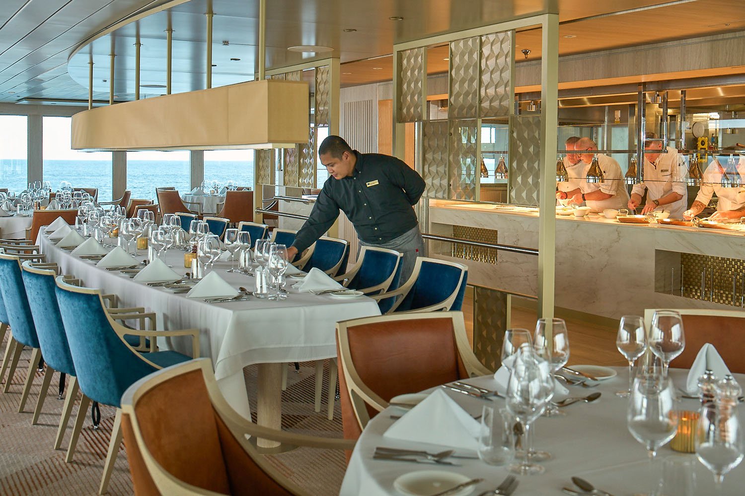 The main dining room aboard, 270º’s name captures its key feature: panoramic windows for views from every table. The daily menu also reflects a sense of the place outside the windows: imagine eating an ethereal Pavlova as a berg floats lightly by? A selection of plant-forward options, including artisanal vegan cheeses, and a casual, no-assigned-seating vibe makes 270º uniquely welcoming for all.