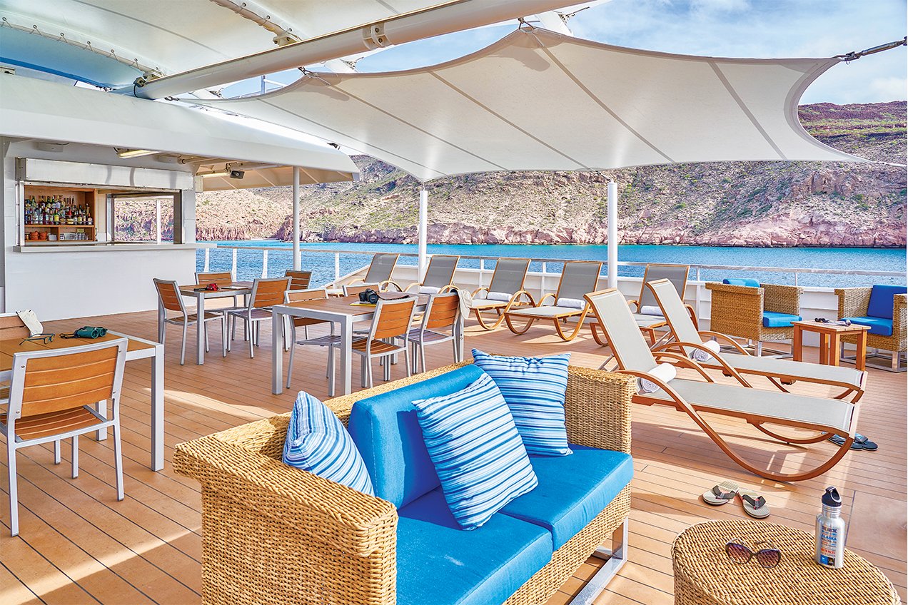 Reception; main dining area; global gallery; fitness center; lounge with full-service bar and state-of-the-art presentation facilities; observation deck; mudroom with lockers for expedition gear; partially covered furnished sundeck; plus open access to the Bridge, the captain, the officers, and on-duty wildlife spotters.