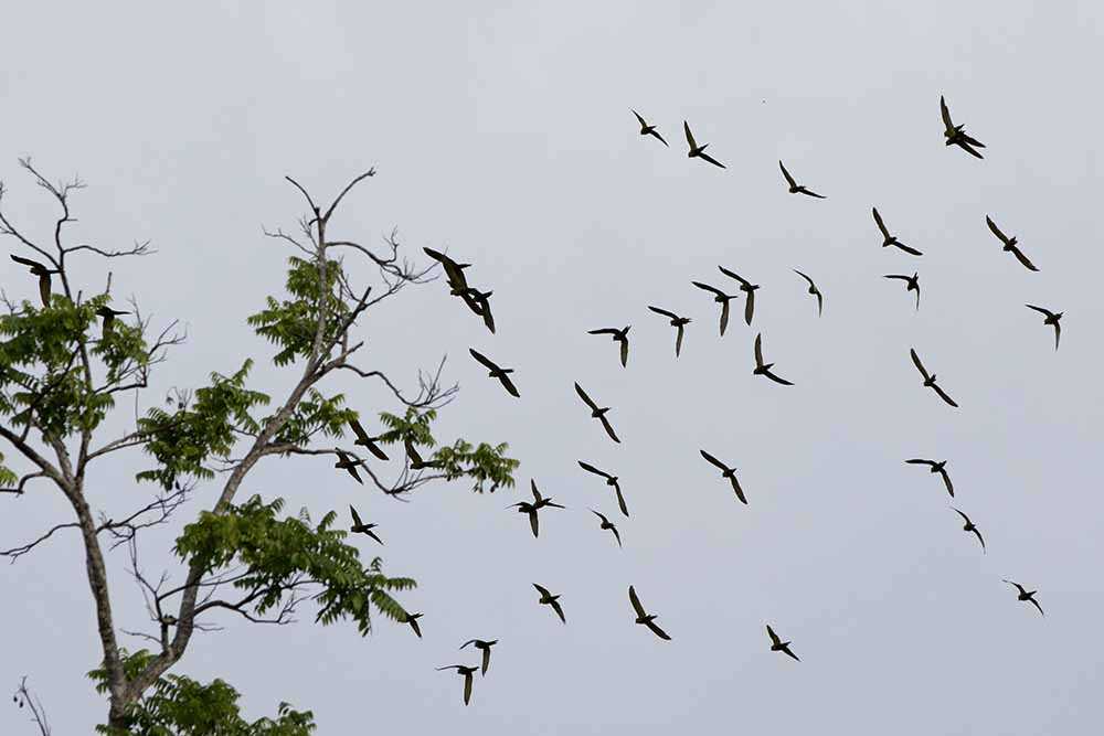 In the afternoon we disembarked to visit Yarapa River. Here, we went for a walk in the forest among large fig trees and palms. The trail took us to a clear spot in the middle of the forest. It was a swamp full of giant lily pads and wading birds! It was surprising to see lily pads in the middle of a forest ruled by giant trees and vines and epiphytes. Most trees are fruiting at this time and very often they host large flocks of fruit eaters, some are the amazing and colorful macaws! The rivers are teeming with wading birds, fish and pink dolphins.