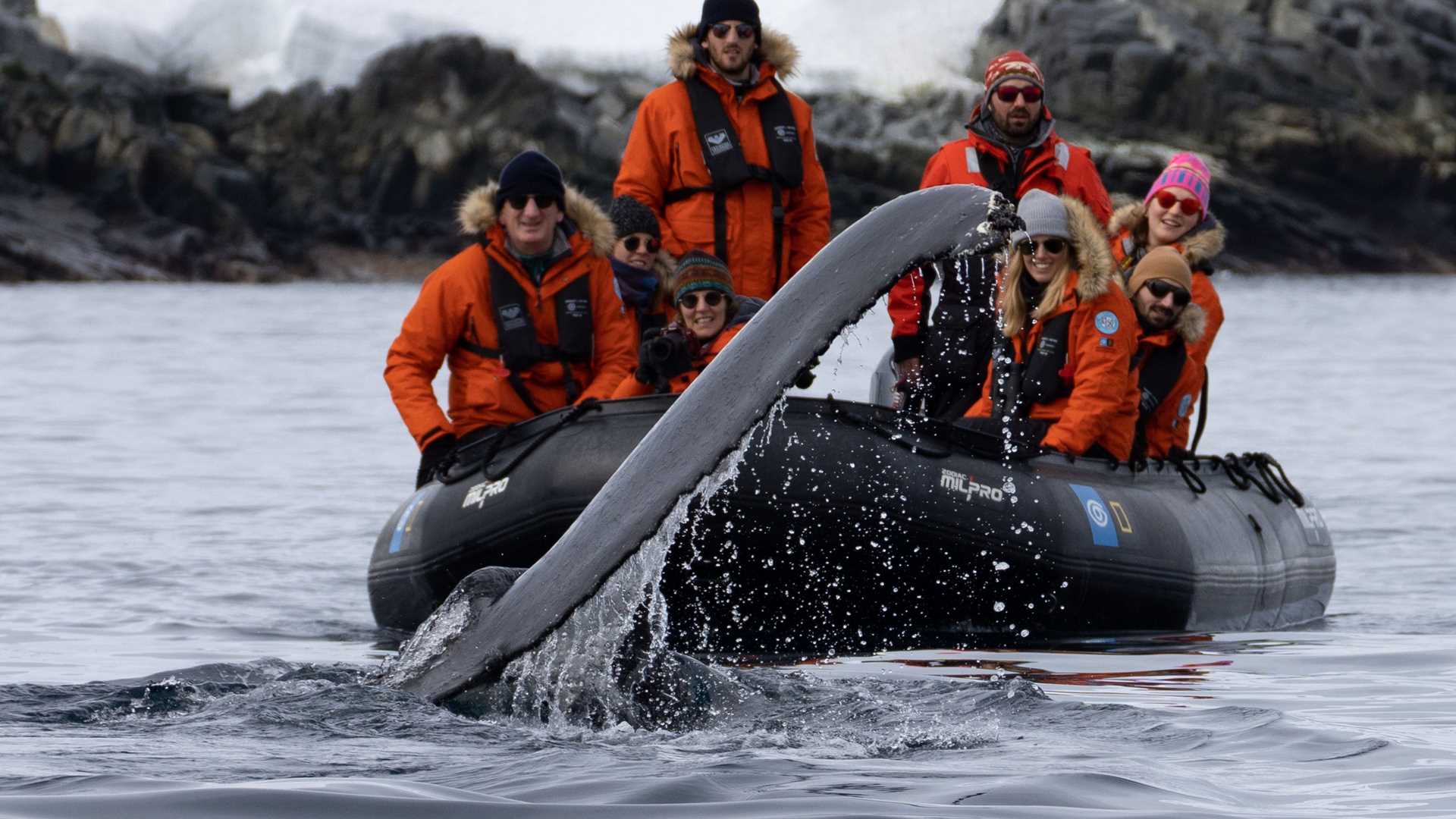 We spotted whales while kayaking around enormous blue icebergs today. As we participated in a thrilling polar plunge in the icy waters of Mikkelsen Harbor, we saw porpoising penguins amidst even more whales. We enjoyed a thrilling Zodiac ride through the narrow cuts of Spert Island, and… can you guess yet? Still more whales! Finally, after a long and magical day, we sailed into the sunset… accompanied by whales, of course.