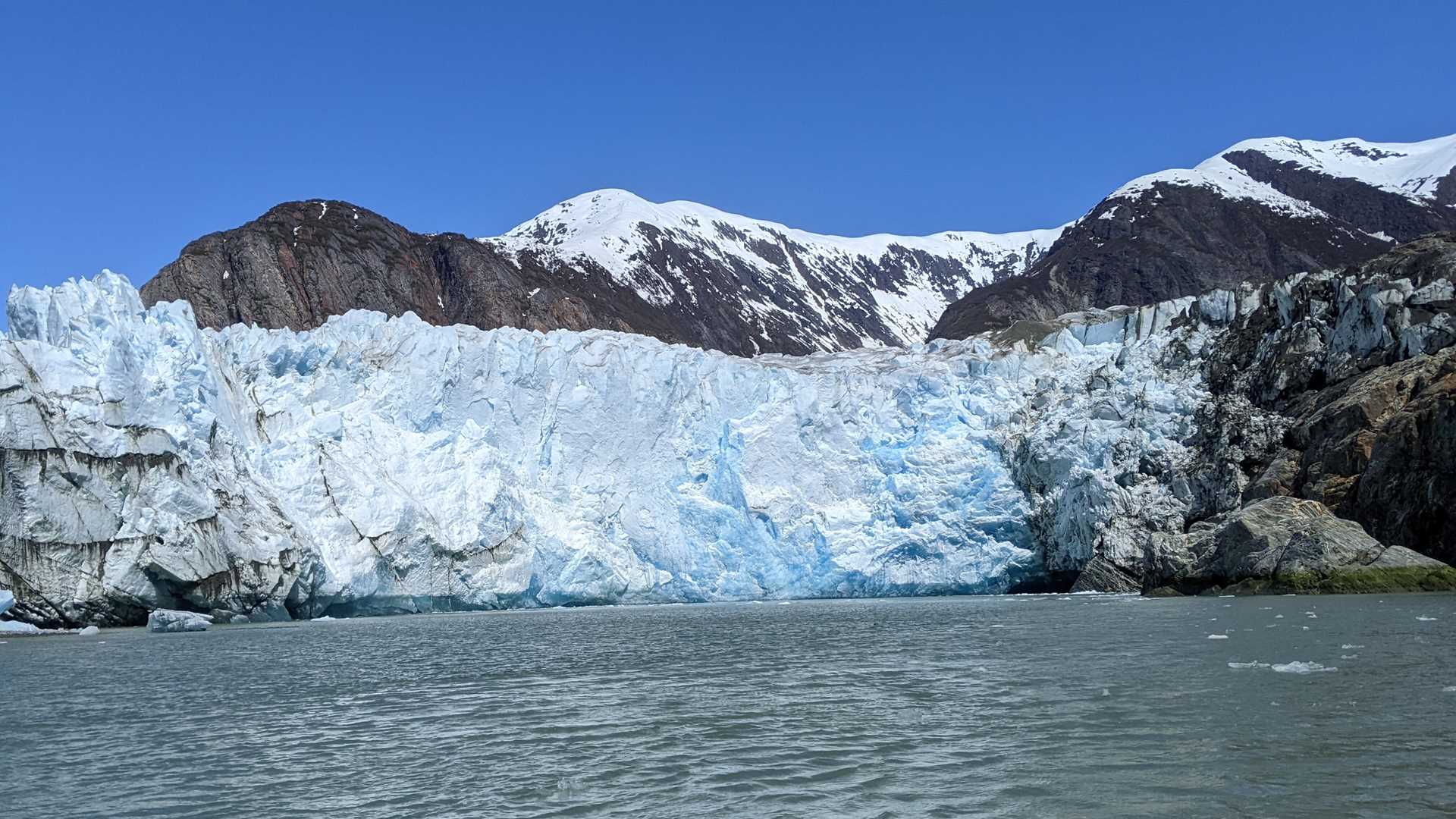 Our last day at sea began with several guests gathered prior to 5:00 a.m. to view our arrival to the breathtaking Tracy Arm Fjord. National Geographic Quest maneuvered slowly to allow for a calm viewing of the nearly sheer granite mountains on either side. The fjord provided amazing views for the entire journey. As we closed in on our destination, we launched Zodiacs, which traversed the floating ice to get us as close as possible to the calving walls. A surprise boat filled with crew dressed as Vikings caught up to us and offered spiked hot cocoa as we pushed forward. As we moved toward the passage to South Sawyer Glacier, it became clear that we would never be able to make it through the ice to approach the glacier. To our shock, the passage north of Sawyer Glacier was completely clear. We successfully navigated all the way to the quarter-mile safety distance. Sawyer welcomed us with a massive and unexpected calving upon our arrival, inspiring shouts of joy as fists were sent into the air.