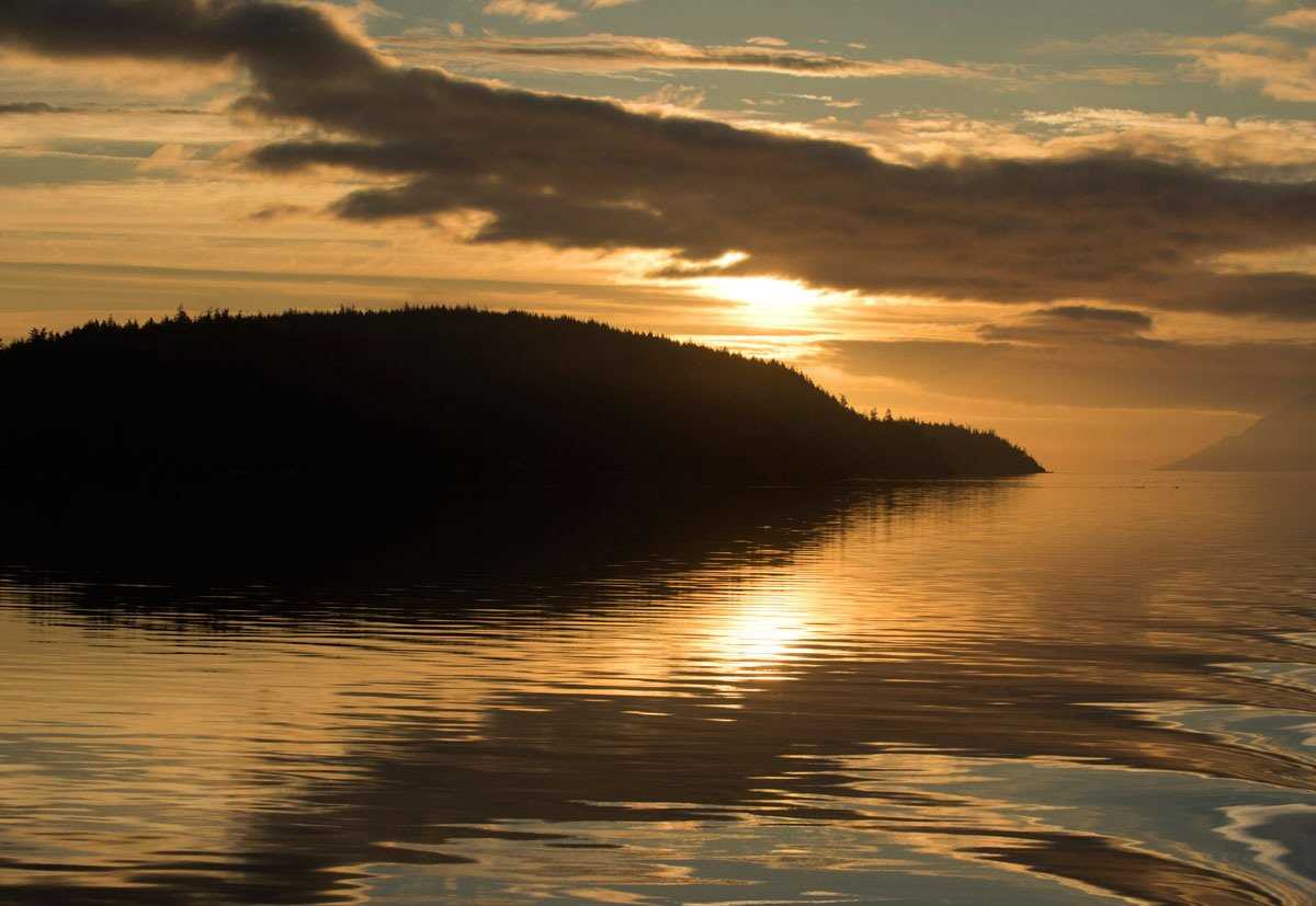 As the sun rose in the eastern sky, the National Geographic Quest was making her way north through Johnstone Strait. Looking to the east we watched the sun make its way up behind the coastal range of the mainland of British Columbia. The light was shifting from bright peach to a deep golden hue as the sun moved up and over the landscape bringing light to our surroundings. To our left, Vancouver Island and its mountains were shrouded in mists which deepened as we moved north. Shortly after breakfast the Quest was shrouded in fog. Many of us remained on the bow watching common murres darting in and out of deep fog banks.