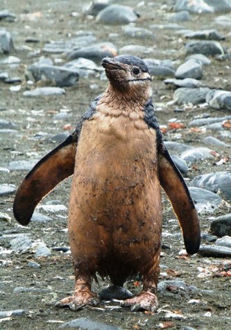 Barrientos Island is home to two of the three brushtail penguins, the gentoo and the chinstrap.  The gentoo is the third largest penguin and the chinstrap is fairly close in size.  They are both nearing the end of their perspective breeding cycles.  The chicks of both species are about ready to fledge and enter the ocean for the first time and venture away from land for a few years before returning to start breeding themselves.  The adults are going to do the exact opposite and begin their molting process during which they stay on land for another three weeks as they grow an entire set of new feathers in place of the older ones.   Once on shore we could see the chicks and adults going about their business.  This time of year the snow has melted and it has been replaced by a combination of feathers and “mud”.  The penguins are not always clean but they are always entertaining.