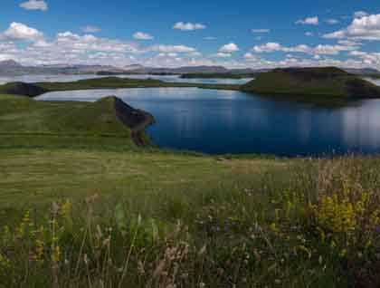 Our next stop was Lake Myvatan, named after the normally millions of tiny midges that are the curse of most visitors. My means lake and vatan is the Icelandic word for midge. When we were told this some thought this might be a stop best experienced from the comfort of the bus, a thought reinforced by the head nets we were given as we boarded the bus. Much to our relief the Norse gods must have felt pity for us and delivered a strong breeze to keep us free of the marauding insects. Either way, the spectacular views of the lake would have been worth the discomfort of the little flying irritants.
