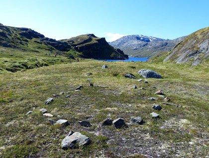 But we were not the first to step here. Above our landing was a skillfully constructed chamber of rocks, and nearby, on a flat surface were several rings of stones that once held down the edges of caribou skin tents, each housing an Inuit family. How long has it been since children scampered over the rocks in games of catch-me-if-you-can, and women watched anxiously for their mates returning from their hunting trip? Did they celebrate success as they pulled the sealskin kayaks onto the very beach on which we landed, and gave the prey a drink of fresh water as thanks for giving themselves to the people? Did they encounter a party of Norsemen coming up the fjord in their longboat, perhaps looking for land suitable for farming? Did they trade with the Norse, walrus ivory in exchange for iron tools, wood, or decorative beads? Did they wonder when their trading partners disappeared from the Greenlandic landscape? So much for us to ponder.