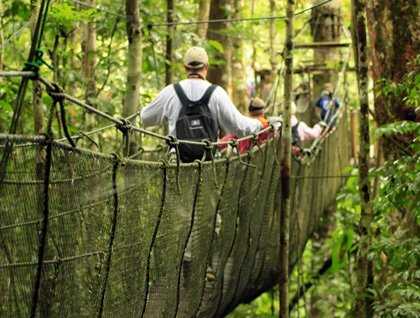 The long walkers went farther in the trail. They had the thrill to cross a fairly long suspension bridge which is approximately a quarter of a mile in length. The bridge allowed us to have an exciting walk in the middle strata of the rain forest. We were above the ground, the highest point about 90 feet, watching the rain forest from a completely different perspective and feeling in some way how the inhabitants of the rain forest see the world in a dimension that is completely new for us.