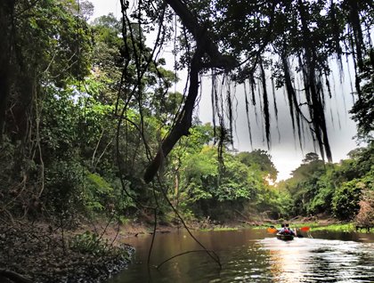 We began with a paddle across the fishponds, where we found long-nosed bats all lined up on several thick sticks that were stuck in the lake. The cryptic coloring of the bats could easily convince you that they were simply bumps on a trunk. Upon reaching the far side of the lake we took off on the trails and were introduced to a forest with magnificent buttress root trees, vines as thick as your arm, and the opportunity to mosey across several mid-canopy level bridges. The bridges brought our view to more of a monkey eye level, and some of us were actually able to look down upon as a small troop of saddleback tamarins came scampering through the jungle. As this group of small monkeys moved through the forest, they seemed to be slightly perplexed to be looking up towards people, their viewpoint was a bit different today as well. Upon return, our crossing of the lake was accompanied by a rousing round of row, row, row your boat, giving our paddlers a bit of rhythm to pace their work to.