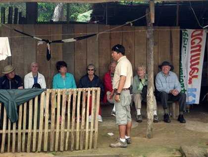 Right after breakfast the rain stopped, and our visit to the village was a total success. Children were little by little gathering at the edge of the riverbank, waving madly to our guests as we walk in the ship’s corridors. Once ashore, we got to walk by their houses, and despite their chores, there was always time for a friendly smile, a wave-back, and even an informal chat with some of them.