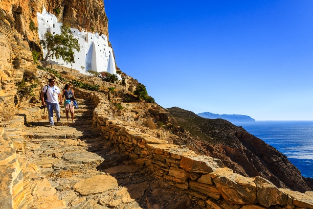 Multiple stories high and just a few meters wide, the monastery is practically pasted onto the sheer cliffs high above the sparkling turquoise waters of the Aegean. Although it is whitewashed today, the stone of the monastery was unpainted in its earliest centuries, allowing this important structure to blend into the natural landscape and escape notice by pirates and other hostile invaders. After hiking up the donkey path, we donned the appropriate clothing—long skirts for women, long pants for men—and entered the monastery to enjoy a brief respite from the sun and heat. Our visit was capped with a sampling of rakomelo, the honey-flavored liquor favored by the monks.