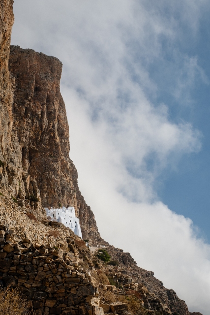 The dramatic southeast coastline of the slender Amorgos served as our first destination for the morning’s exploration of this stunning island. Cliffs soar up out of the sea affording incredible views over the Aegean Sea as we drove along hairpin switchbacks to the road’s end. From this low vantage point we looked up to a magnificent white building clinging to the cliffside, the monastery of Panagia Hozoviotissa.