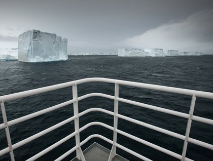 At 6:45 a.m., almost an hour before the scheduled wake-up call, we were roused with an invitation to come out on deck as we approached a wall of ice. This news came as a surprise. We had anticipated going ashore in the Antarctic for the first time this morning when an announcement revealed the winds were too strong on this wild, windy, eastern side of the peninsula and that we were changing course. The call came as we were retreating back north out of Antarctic Sound, at the extreme NE extent of the Peninsula, and just as we began to slalom through the broken up, grounded remains of iceberg B15Y. Yes, icebergs are so large in the Antarctic that they are sometimes given names. For the next hour and a half we cruised along the textured extent of a piece of ice so large that there are (14 years after it broke off from the opposite side of the continent) 26 pieces, each still over 10 miles in length. Like white monoliths from the deserts of the American southwest, the ice rose in 100 ft. tall mountains, flat-topped and angular compared to the turbulent ocean and wind stretched clouds. Braving 40 mph winds all hands were on deck to take in the largest continuous piece of ice any of us are likely to see again in our lives.