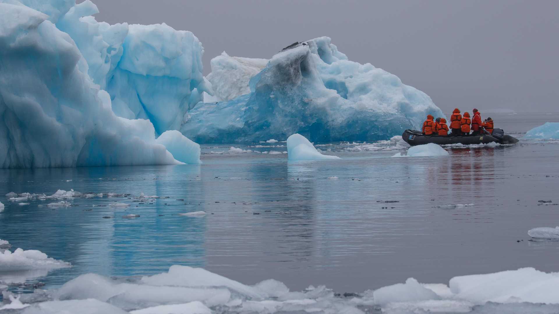 While half the guests were on shore the other half joined a Zodiac cruise around a multitude of icebergs throughout the area. On scattered bergs the Adélie chicks found their way to clamber up the slippery ice slopes. Most of them looked quite confused as to what they were supposed to do and how to be a penguin since they were essentially not taught the details. One particular hazard they were not aware of was leopard seals searching for the unsuspecting penguin. Some of the cruising Zodiacs were witnesses to some of these unlucky penguins becoming a morning meal for these predatory seals.