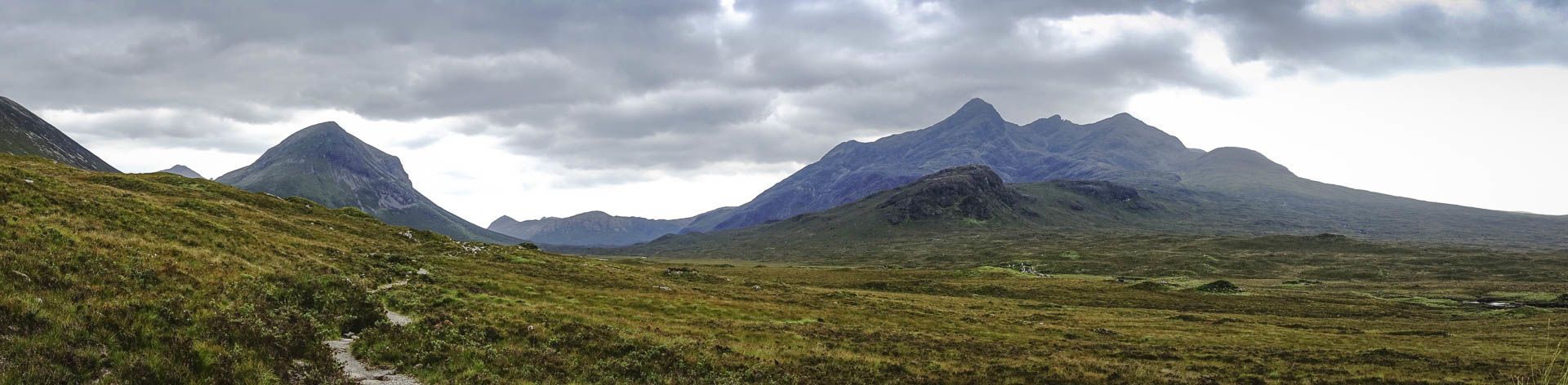 The alternative outing for the afternoon was a hike with Robin and Stewart into Sligachan Valley in the heart of the magnificent Cuillin Mountains on Skye, known for the high and rugged peaks. Our walk took us between the Black Cuillins and the Red Cuillins, with lowland moorland surrounding us, complete with heather and bog. Most of Skye was formed from volcanic activity over 60 million years ago, and the Black Cuillins are volcanic gabbro, the Red a volcanic granite. The landscape has been subsequently shaped by erosion and carved by ice during the Ice Age, creating dramatic scenery.