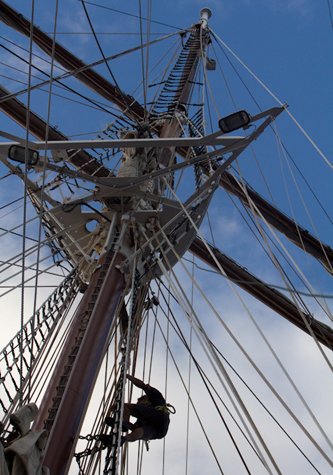 The first day of our voyage started with sunshine on a beautifully blue sky, but also with very strong winds. Luckily last night we motored to be near St. Lucia – in a position with a little less wind that would allow us to set some sails and hope for a good sailing angle on the wind and seas. The deck crew was already standing by at 8:00 a.m. The ship was rolling, so imagine the amplitude of the swaying mast at 50 feet high! That was definitely a job for only the most courageous crew members to climb up these masts. We all were amazed by how easy it looked, but we knew how difficult and scary it is in reality. Surrounded by boobies plunge-diving to catch flying fish, we sailed with topsails set at an exciting speed of about 7 knots.