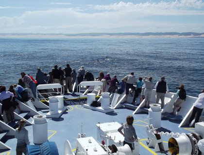 After a lovely lunch in the open air on the back deck, National Geographic Orion continued her sail northward towards Port Elizabeth, along the Whale Coast. As we neared Bird Island, we had a great illustration of why this stretch of sunny South African coastline is thus named. We came upon a spectacular feeding frenzy and had one of our first whale sightings of the expedition! The first animal spotted off the port side was a small baleen whale, and we all rushed out to the decks to have a look. Then National Geographic Orion nosed her way towards the real action, a great gathering of wildlife—fish, mammals, and seabirds—near to Bird Island, all of them feeding, probably on a sardine run beneath the waves.