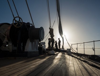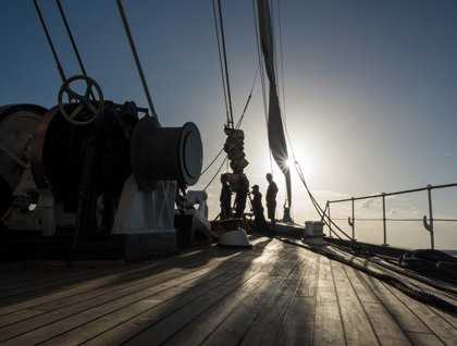 The spanker deck was full of eager and interested onlookers with sail diagrams in hand, as Captain Komakin sent the crew to sail stations at 0900. Expedition leader Tom O’Brien explained the play-by-play action, as the horizontal spars on three of the four masts suddenly began to swing around in near-unison. We were bracing the yards square for a downwind sail to the west, expecting to take the wind from about 30 degrees to our starboard quarter. “Hit the Rig!” came the next command, and the three mast teams scurried aloft and out on the yardarms to prepare the sails for setting. “Sails in Order!” and square sails began to unfurl on each of the masts. Then more, and more, and more, and suddenly we noticed that the engines were off and we were sailing. We all moved forward to the fo’c’sle for the setting of the outer ji and the fore course, and there we were aboard the glorious hand-sailed tall ship Sea Cloud in all her glory, sailing at 6.5 knots as steady and stable as could be. This is what we dreamed of.