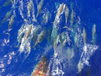 At sea a unique and pure currency exists onboard that is constantly being generated in our minds. It has varying denominations, moments, which combine into stories and with enough of those they add up to an experience. There is no calculable exchange rate but it thrives amongst shipmates as we all generate this intangible coinage. Over meals this tender is passed back and forth, as we share anecdotes and reports of things that we’ve seen and done, recently and long ago. They can’t really be bartered, as perhaps could be said for favors, like writing a Daily Expedition Report for a fellow staff member as a birthday present. This is purely an example, as it isn’t at all an unwanted task or hardship, but just to illustrate a different form of trade. Especially one that might occur on a 26-day voyage across the entirety of the Atlantic where one might run out of things to write about the open ocean. However there truly is never a dull moment, as just when one might be grasping at straws thinking of how many ways to describe the azure depths that surround us, a massive pod of dolphins appeared on the horizon!