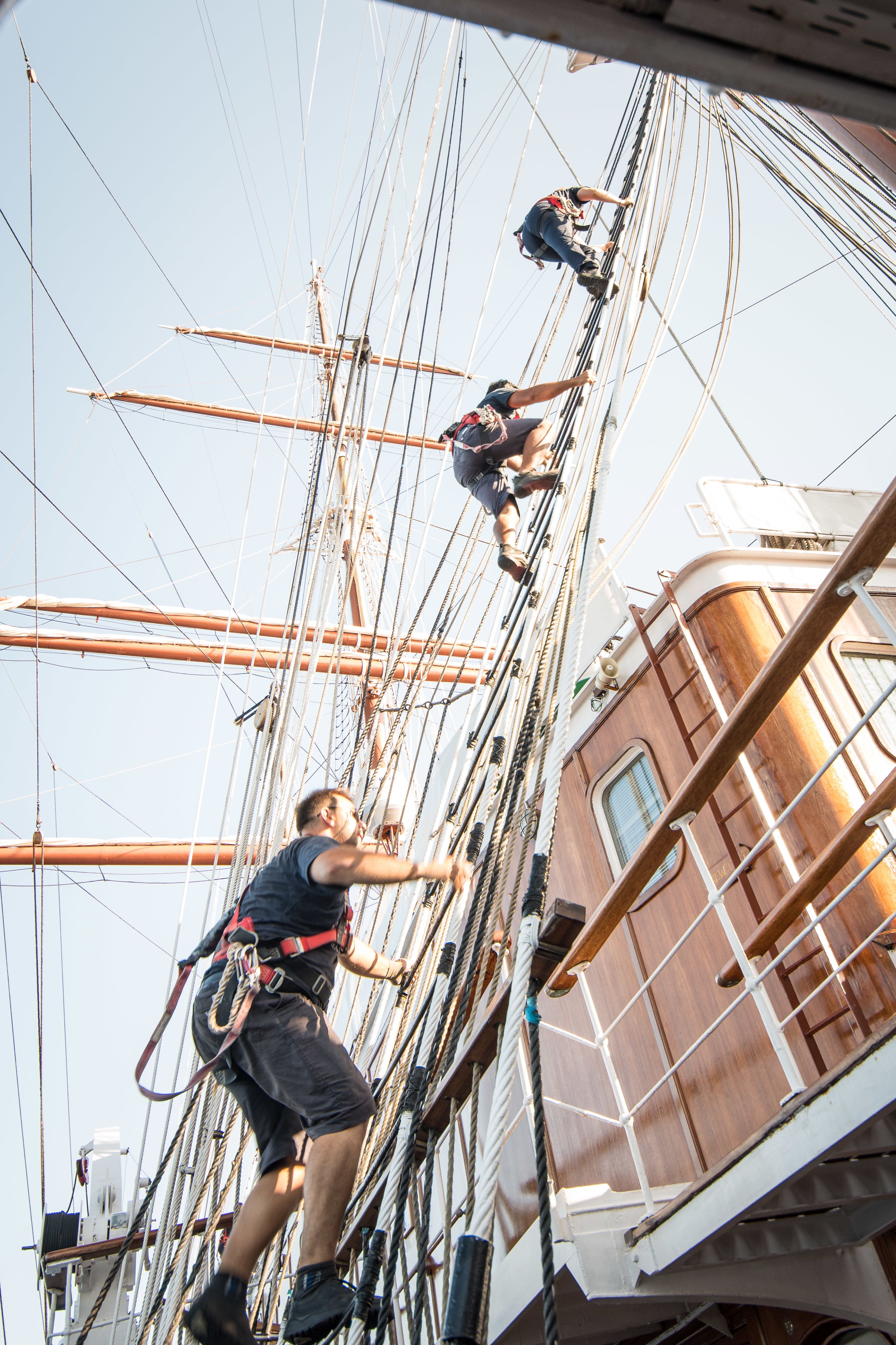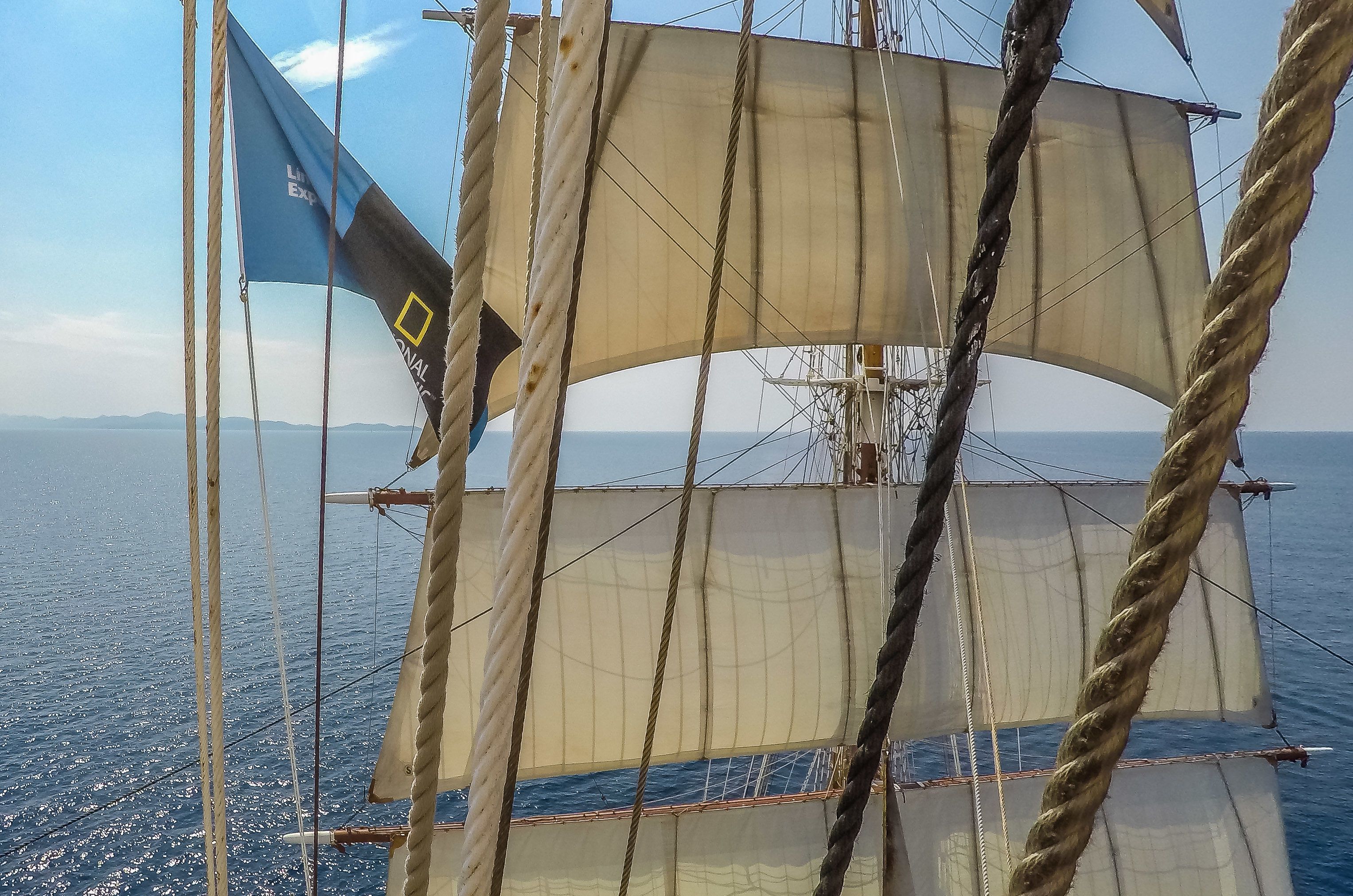 We began our journey aboard National Geographic Sea Cloud today with a sail through the Cyclades and a sail introduction. We learned the intricate workings of “hitting the riggings” and watched National Geographic Sea Cloud crew go aloft and set the sails. Once all the sails we up, we were introduced to the staff and guides, followed by a presentation on photo composition. Afterward, we had a bit of time to walk around the ship, bask in the sun, or rest.