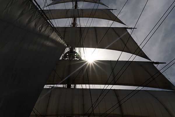Everybody loves a day at sea on Sea Cloud, so the Spanker Deck was full as the play-by-play descriptions of the setting of the sails began. With symphonic orchestration, the ship came alive as lines were hauled, yards were braced, jibs were raised, and square sails were sheeted home. We moved forward through the one-hour process of setting the sails, finishing on the raised fo’c’sle with the jibs, and the beautiful bowsprit protruding ahead. This was what we came for!