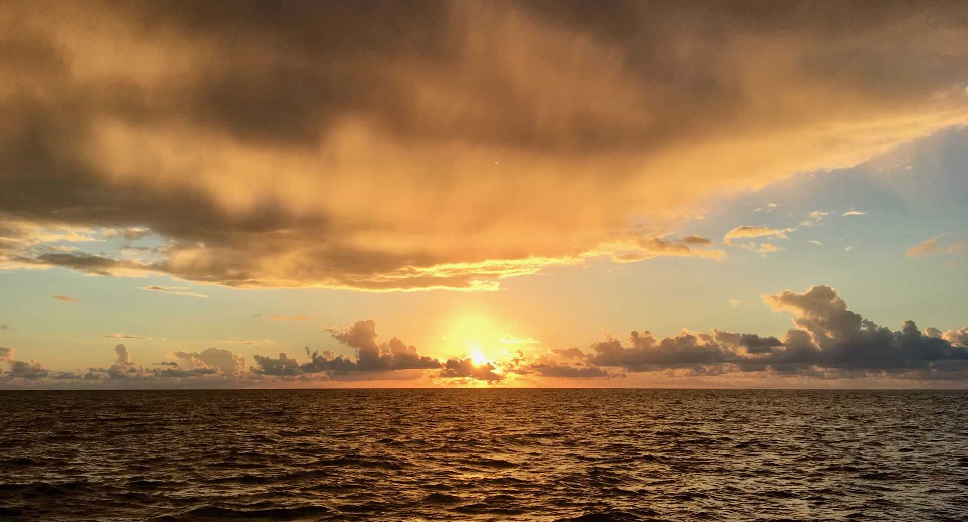 The sky is the other half of this world, and it is as full and ever changing as the surface of the sea is featureless. The ocean changes day by day, sometimes in just a few hours, as storms and sets of swells come and go, but the cloudscapes of the tropical Pacific change every minute, from the first light before sunrise until the light fades again in the evening. There is almost always a beautiful layer of small, puffy cumulus clouds low over the sea, moving quickly in the surface winds. Sometimes the larger ones trail grey tails of heavy rain below their flat bottoms, squalls that come and go in a few minutes. Much higher in the sky there are multiple layers of cirrus and alto-cirrus, usually only wispy horsetails, sometimes gathering into broad, textured mackerel skies. The sunrise and sunset light play through these various clouds like a symphony, one layer after another, golds and pinks and purples swelling and fading like movements of music, building to a crescendo, then slowly fading into day or darkness.