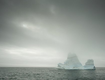 Continuing west, a thin band of light slipped into view during a break in the fog. Nearly indistinguishable from grey sky, our initial glimpse of east Greenland began to take shape around 3pm. Folded into the horizon, the dark flanks of Scoresbysund emerged first, offset by the Rorschach remains of winter’s snowfall, to be followed eventually by a thin band of glacial ice underlining the skyline. Within two hours of this welcomed sight, we were at the 12-nautical-mile-wide entrance of this massive, flooded glacial valley with a sentinel of ice between us and the innards of the fjord system beyond. Emerging from the fog a lone, spire-like iceberg drifted motionless at the entrance, reaching just high enough into the low atmosphere to create its own, tiny microclimate overhead. Our approach and subsequent circumnavigation of the trip’s first substantially sized piece of ice lasted nearly 60 minutes, with a barrage of images to show for it.