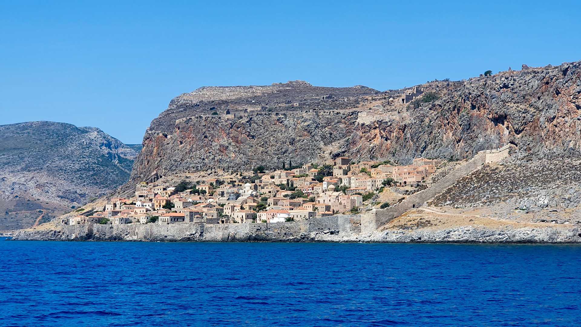 After a brief stop for another opportunity to swim from the ship, we continued our journey northwards under power. This took us very close to the peninsula of Monemvasia, a great mass of rock that juts into the Aegean Sea. Monemvasia means “single entrance,” referring to the thin causeway that connects it to the mainland. The impressive city walls of the lower town convey a resounding “no thanks” to would-be invaders. They were erected by the Byzantines to harbor refugees during the Slavic invasions in the 6th century. By the 15th century, Venetian forces had occupied and fortified the summit during their ongoing wars with the Ottomans.