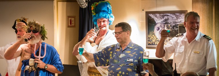 Accompanied by trusty Davey Jones and “beautiful” Queen Tethys, King Neptunus Rex, Ruler of the Raging Main, burst into the lounge late last night demanding retribution and royalties from the crowd at hand. Uninitiated Pollywogs, once relegated to a single hemisphere, had to Kiss the Fish in order to pass safely from south to north. Uptake of the cleansing elixir and a toast to the sea made us all Shellbacks and members of the Solemn Mysteries of the Ancient Order of the Deep. We may not be on a multi-year voyage around the world nor stuck in the fo’c’sle of a creaky sailing vessel, but we’ll certainly talk about this ceremony for a long time. And if anyone forgets, there are plenty of pictures to prove it.