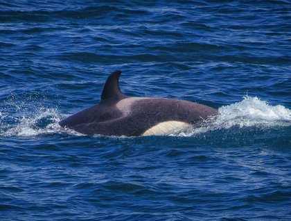 Around eleven o’clock in the morning there was real excitement as an extended family group of killer whales was spotted from the bridge. We had excellent sightings: males to the port side of the bow showing their massive paddle flippers, and females with calves to starboard displaying the distinctive counter-shading of the orca, white under-parts with black on top for camouflage purposes, a pronounced dorsal fin and the individualized eye and saddle patches that have helped marine biologists track the history of individual animals over recent years. Opportunities to watch the social behavior of these intriguing creatures at sea are exceedingly rare and for many this will be a highlight of the voyage, one that is only just unfolding.