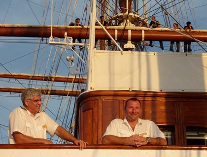 Light winds mean more sail, and at 0900 the crew was aloft in the rigging, preparing the rest of the square sails and the jibs. Chief Officer Steve Tarrant, an instructor at the Maine Maritime Academy, gave a “play-by-play” explanation of the setting of the sails, which turned the complex and random lines and rigging into a well-organized and coordinated machine.