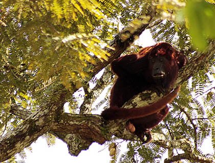 After having breakfast we continued exploring the area. It was a successful late morning in terms of wildlife sightings. We spotted a big male red howler monkey resting peacefully on a branch of a tree. This monkey species is one of largest monkey species in South America and one of the most famous and attractive, for they have one of the most impressive vocalizations in the Neotropical rainforests. It was relatively close to their observers. Those guests with longer telephoto lenses had very good photographs of this monkey that is usually found in the high canopy. Through binoculars all of us had an excellent sighting of the facial features of the monkey and were marveled by the bright and unusual reddish coloration in this monkey species.