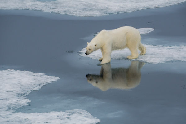 Today started early this morning aboard the National Geographic Explorer. But in the land of the midnight sun, the only way one would realize the time is by looking at a clock. And since polar bears do not follow our preferred schedule onboard, we eased out of our cabins a few hours before breakfast when we heard the call that we should get out on deck. We were met with spectacular golden light from a low hanging sun and a young male polar bear with his nose in the air, slowly making his way toward the ship, and a hooded seal resting on the edge of the ice pack. While the young bear jumped, swam, rolled and rested right in front of us, we also spotted five more bears in the distance. Eventually our visitor bid us farewell and left us so we headed out to our next stop down the coast.