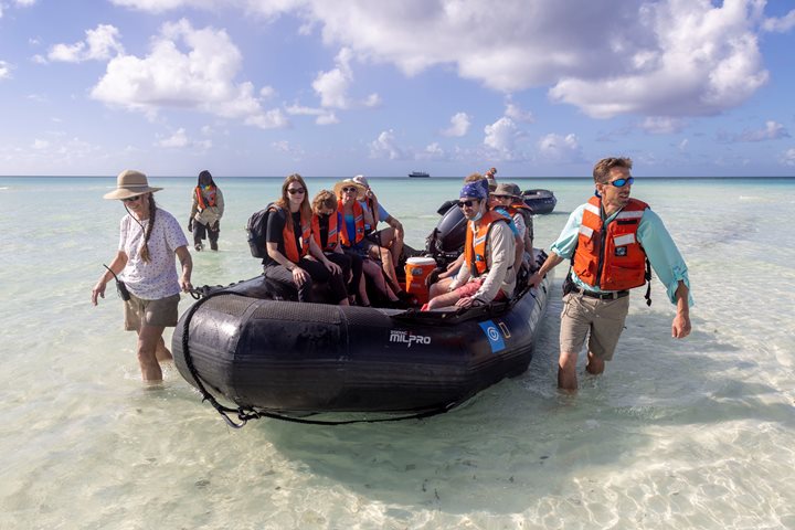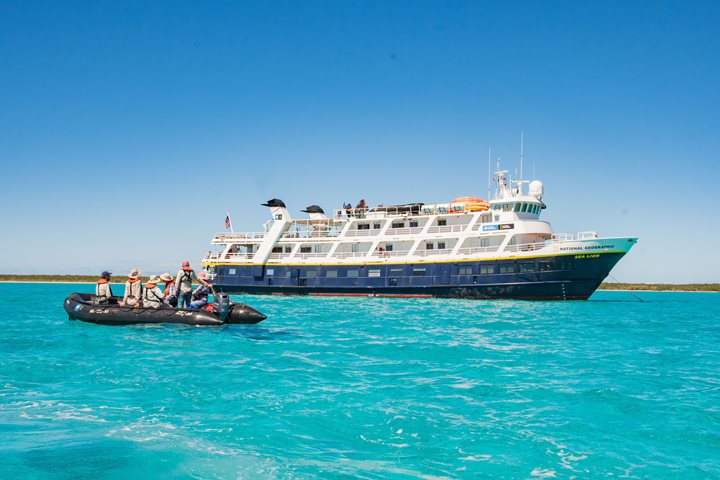 Lindblad’s historic inaugural expedition to the Bahamas last week has come and gone. We have fueled up, onboarded new guests, and embarked on our second week of exploring these wonderful, fragile islands. This second week will bring new adventures and discoveries as we continue to add new spots and destinations to our voyage. Just like week one, our first stop for week two was Long Cay on the Bight of Acklins. With much better weather conditions, we were able to anchor on the southeastern side of Long Cay, which means we were much closer to the areas we wanted to explore. After we dropped anchor, we had several briefings onboard, including our Zodiac safety briefing. Our first activity was to get in our Zodiacs and make our way up the island as we scanned the coast for the small resident flock of flamingos. Fifteen minutes into our Zodiac ride, we spotted a small group of flamingos (called a flamboyance) flying in and landing along the coast. Their bright, vibrant pink plumage stood out amongst the calm, azure, crystal clear waters. We were able to get close to the flock of birds without scaring them off. After a lot of whispers about the conservation story of these birds and hundreds of camera shutter clicks, we started our engines again and headed back to National Geographic Sea Lion . After returning to the ship, we enjoyed a quick presentation by Aaron Raymond on, “Photography Basics and Techniques.” After lunch, we got briefed and fitted for our first snorkeling adventure in the afternoon. During this time, we lifted anchor and repositioned National Geographic Sea Lion to the west coast of the island, where there are more coral reefs. Our afternoon snorkel spot was a shallow coral reef that ran parallel to an incredibly beautiful and picturesque beach. This beach, like many others in the Southern Bahamas, probably has not seen human foot traffic in years. We settled there for the afternoon to use our snorkel gear for the first time this trip. We were eager to give our guests their first look at a Bahamian coral reef and the threats they face. After our afternoon beach hang and snorkel, we returned to National Geographic Sea Lion to end our first day in paradise. The calm seas and almost cloudless skies gifted us with a picture-perfect sunset that painted the skies in different shades of red and orange. After we enjoyed this graceful moment, we had dinner and came together to talk about national parks and conservation efforts in the Bahamas.