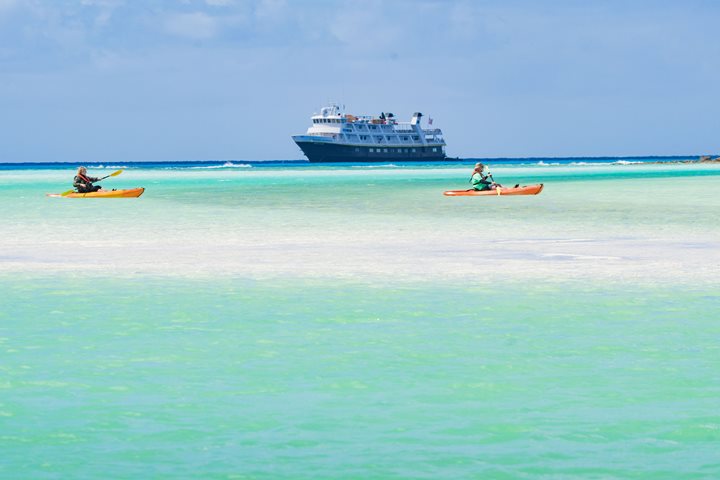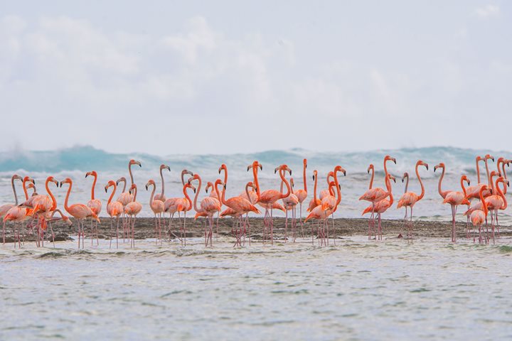 Welcome to the Ephemeral Isles. Early this morning, National Geographic Sea Lion approached Crooked Island in the southern Bahamas. We were greeted by a graceful sunrise, marking the beginning of Lindblad’s first ever expedition to the Bahamas. This inaugural expedition seeks to explore the rich natural history, culture and landscape of the remote, pristine southern islands of the Bahamas. Even though these chains of islands are only a short distance from the coast of Florida, this is the first time a Lindblad ship has ever explored these waters, making this a true ‘expedition’ for all the guests, staff and crew on board. After a long, rocky crossing from Exuma to Crooked Island, we dropped our anchor off the southern coast and got ready to embark on this new adventure. For our first adventure, we set out on Zodiacs to explore Long Cay and get our first look at these beautiful islands. We were also looking for a very special bird, the West Indian flamingo. The flamingo is the national bird of the Bahamas, and they are reliably seen only on the southern islands of the Bahamas. We had pretty good knowledge and a record of a small flock that frequents the eastern side of Long Cay. After about a 30-minute ride across the sea and onto the Bight of Acklins, we scanned the shoreline of Long Cay until we spotted some hints of pink. Indeed, we spotted about 20 flamingos at first. Another flock joined them later, increasing the number of birds to about 60. We observed these majestic birds in their natural habitat for about 20 minutes. After this, we headed back to National Geographic Sea Lion to have lunch and then prepare for more adventures. In the afternoon, we headed to a pristine white sand beach on the end of Crooked Island and split into groups. These groups included kayaking and snorkeling. While kayaking, we explored a picturesque mangrove creek that went up into the interior of Crooked Island. There we observed green sea turtles, queen conch, a southern stingray and a few species of native birds. This was our introduction to the magnificence and biodiversity of mangrove creeks in the Bahamas. We kicked off day one of this historic itinerary with a great start, seeing several iconic Bahamian species and getting a sense of the wonder that is the Bahamian tropics. Each day this week, we will explore a different part of paradise, uncovering more discoveries and breathtaking adventures.