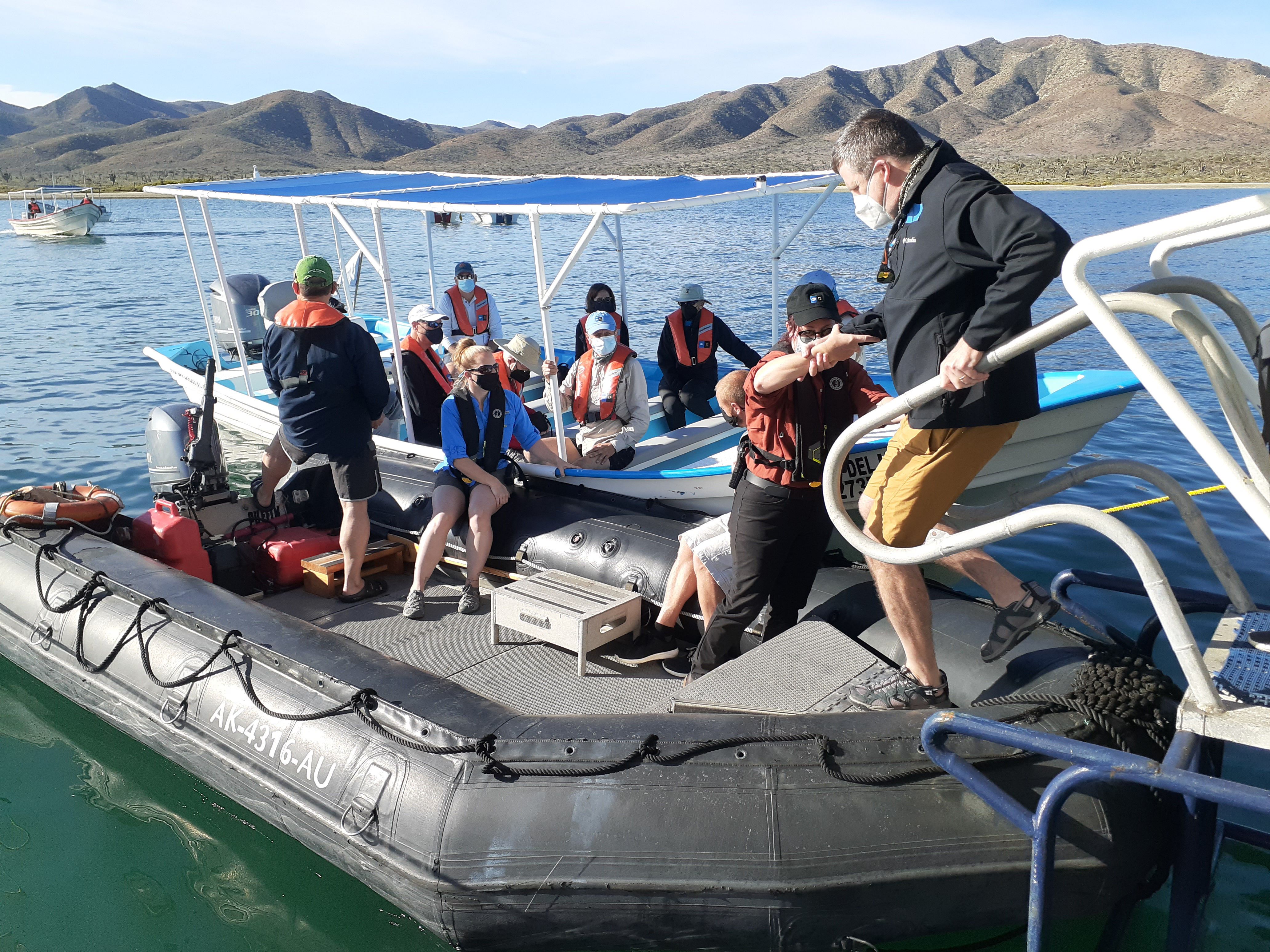 Almejas Bay greeted us with beautiful, clear skies. Allison, our wellness specialist, taught a morning stretch class at 7:30 a.m. After breathing in and breathing out, we were ready for breakfast. Then we met our local pangueros, and off we went for our first whale-watching adventure.