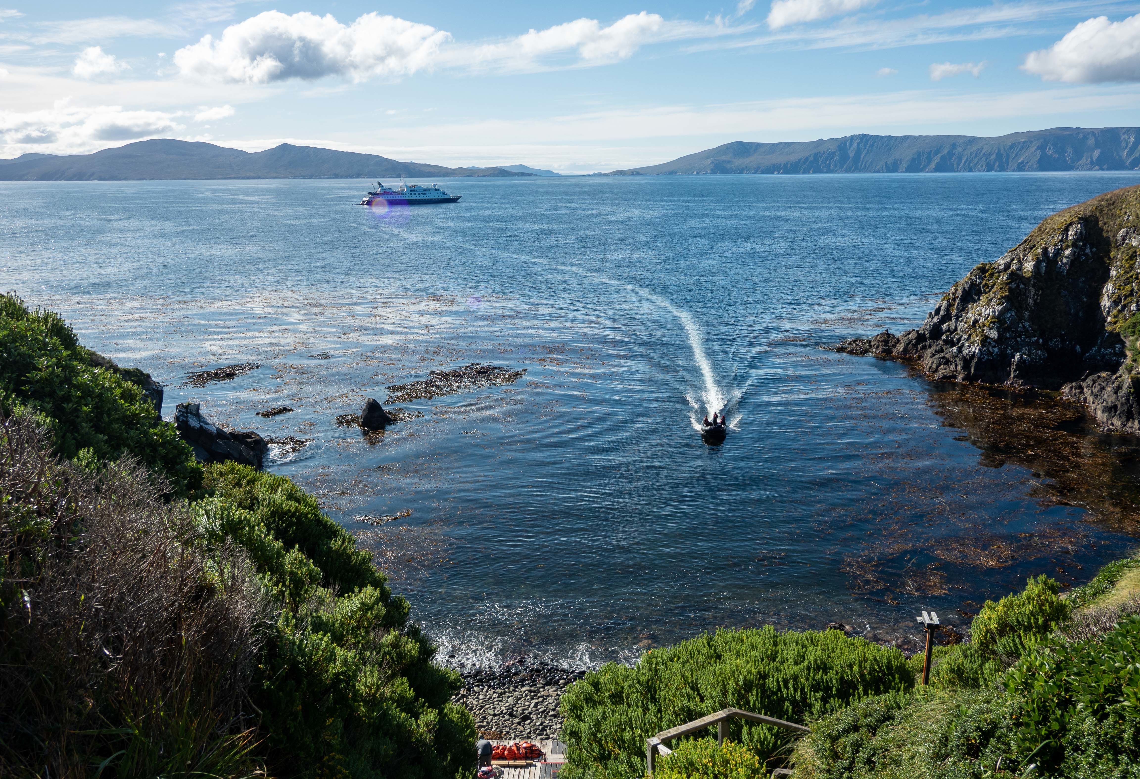Our second full day on this remote and wild island brought the opportunity to explore an ice-carved fjord called Caleta Capitán Cánepa. What a morning! South American fur seals, a southern elephant seal weaner, and South American sea lions cavorted around the Zodiacs. An otter family was sighted both in the water and along the shoreline near a rushing waterfall. Rock and imperial shags, steamer ducks, striated caracarás, Magellanic penguins, and Andean condors were sighted within these protected waters. The steep cliffs and narrow channels made for incredible photographic opportunities! The morning simply flew by with each new discovery.