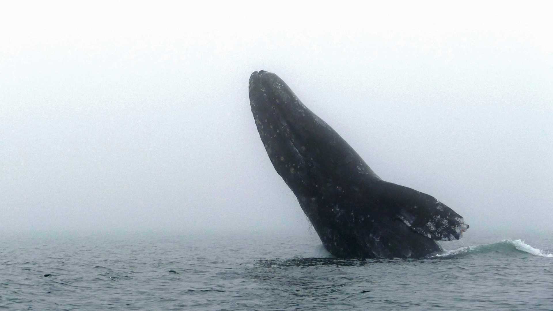 Early this morning neblina (fog) softly enveloped the National Geographic Sea Bird, making the roar of the Pacific surf and the sharp blows of whales’ breath especially audible. Out in our small boats we found the whales by stopping and listening for their breath. Today we watched at least a dozen single California gray whales—some were pregnant, soon to give birth to their 15-foot, thousand-pound offspring, while others were in courting groups, males chasing females about the lagoon and occasionally throwing their flukes skyward or engaging in a breach!