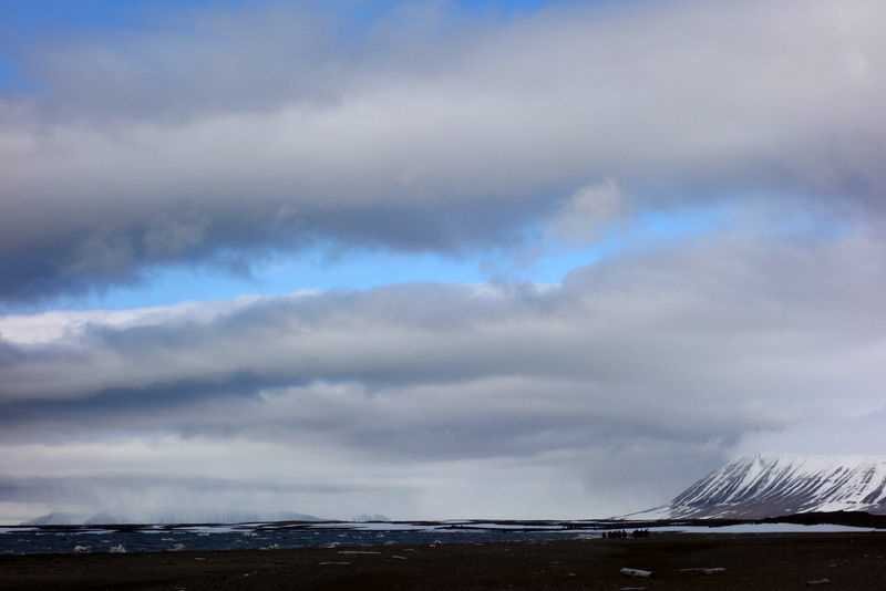 After lunch we found ourselves in the ice again as we made our way around the southern tip of Edgeøya. The mountains all along the coast were still streaked with snow, and, in places, the shoreline was a tangle of ice. After some time scanning and scouting, we made a landing at Andreetangen on the southwest coast of Edgeøya.