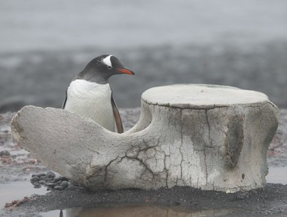 So many of us had been dreaming of this day for so long, and after lunch the moment finally arrived—the first time setting foot on Antarctica, the continent of mystery, misery, and the crucible of the heroic age of exploration. A gloomy, dark drizzle has no hope of dashing our enthusiasm, and with giddy anticipation we load into the Zodiacs for a very short trip to the landing. What a delight it is to discover that the penguins seem to have organized a welcoming party to greet us! Even though we have been told how unafraid the penguins will be, it is startling to find wild creatures that are so relaxed by our visit.