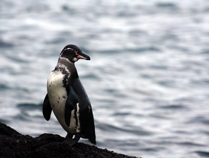 We then navigated to Chinese Hat, an island on the southeast end of Santiago Island, where we went snorkeling again, this time in deep water. Conditions were excellent, we had calm seas, clear water and lots of fish and invertebrates to observe. After this activity, we returned to the same area for a Zodiac ride along the coast of Santiago Island, and we spotted some Galapagos penguins resting on the black rocks of a huge lava flow.