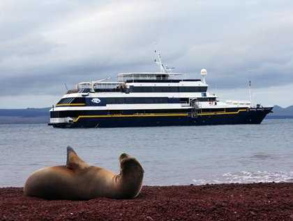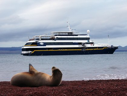 This afternoon we had a chance to go kayaking and snorkeling along the red cliffs of Rábida Island. After these two activities we landed on the shore and found a pair of mating green sea turtles and a Greater flamingo flying into a small brackish water lagoon where it spent some time feeding on brine shrimp. As we got to the shore we encountered some Galapagos sea lions resting on the bright red sand and we spent some time photographing and enjoying the colorful sunset from the shore.