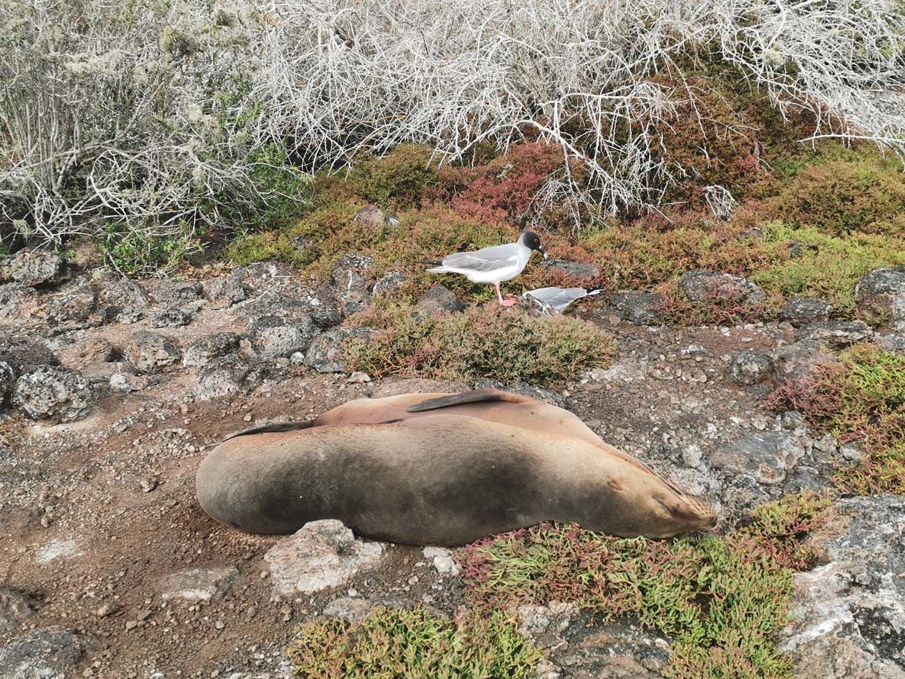 We started our day hiking on Bartholomew Island, a place known as an open book to geology, where we learned about the different volcanic features that started holding the base of primary succession of our endemic ecosystems. Pioneer plants and small volcanic cones were spotted on the way up to the top of the island. At the highest peak, we encountered a breathtaking landscape of Bartholomew north and south beach, with green mangroves in between. After breakfast, we went snorkeling off a sandy beach and as we swam further into the deep water, we spotted a large variety of fish suspended along the vertical walls of the tuff cone that created Pinnacle Rock. A couple of white-tipped reef sharks were also spotted as well as marbled rays and sea lions. Some of our guests chose the option to experience our glass-bottom boat, where you can learn about the marine life in the islands and not getting wet.