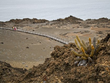 About 400 wooden steps make up the boardwalk built by the National Park some years ago to protect the island from erosion and also to help people get to the top of the island from where you have an outstanding view of the surroundings as well as some other islands in the vicinity. Very few animals are found here as the land is dominated by rocks and the soil is not as productive from lack of humidity. Some lava lizards have become adapted to the area as well as some Darwin’s finches and Galapagos doves.