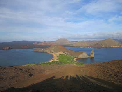 Two of the most beautiful spots of the Galapagos are Bartolomé and Chinese Hat Islands. Both of these small islands are located at the southeast corner of Santiago Island. We can easily see the evidence of recent eruptions and barren landscapes, contrasted with the lush vegetation observed few days ago in the highlands of Santa Cruz Island. After a short navigation, the National Geographic Endeavour dropped anchor in front of Bartolomé. Early in the morning, we headed to the small dock for a pre-breakfast outing, which took us up 370 wooden steps to the top of Bartolome Island. As we were climbing the hills of Bartholomew, we could see all of the cinder and parasitic cones around the path area, and pioneers plants establishing on a new lava rocks. It was incredible to see all of the erosion processes creating new landscapes for species to establish. It felt as if we were going back in time to the early Galapagos, observing the young islands as they emerged from the ocean. Bartholomew is a very young and pristine island, and we are seeing the results of recent efforts to eradicate the introduced rats that endangered the unique species here.
