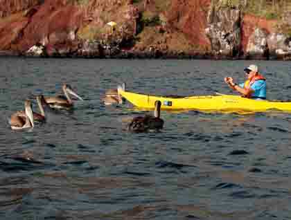 A lot of sea bird species, such as blue footed boobies, brown pelicans, common noddies, shearwaters, and penguins were found kayaking along the coast of Rabida. In the deep water snorkeling, sea lions made our day!
