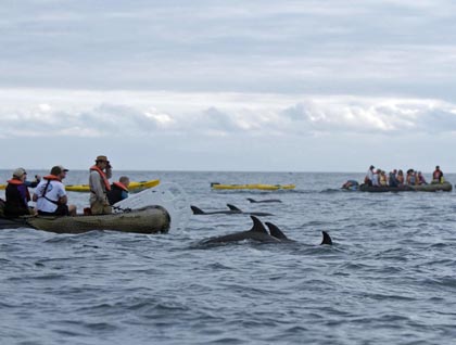 Snorkelers came back onboard the Zodiacs while the hikers and kayakers joined together to witness one of the most spectacular events with these playful marine mammals.