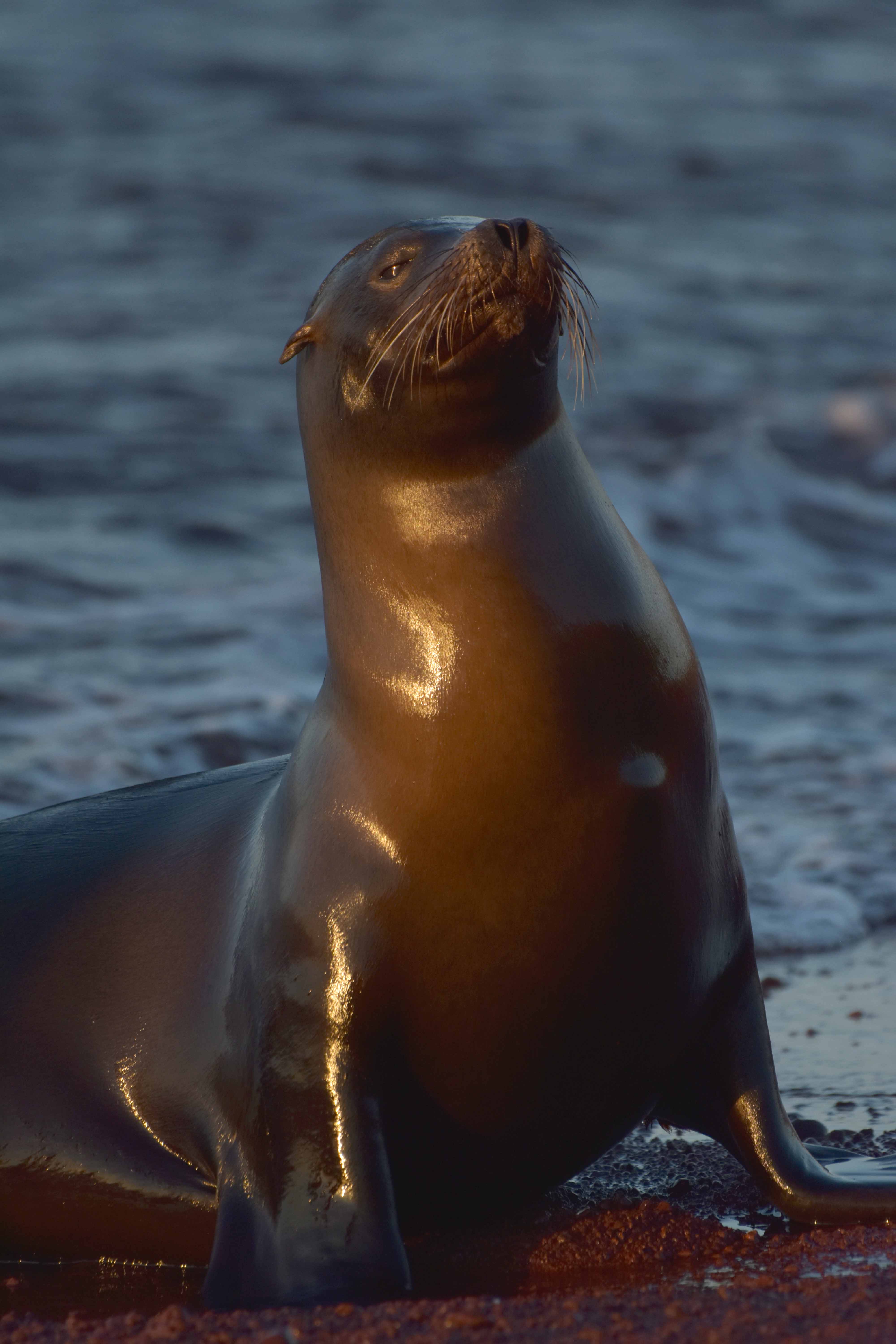 After having a great time in the water we went to walk on that beautiful red beach. Some sea lions were there resting after being in the ocean for several days getting some fish to survive. Behind the beach is a very small brackish water lagoon where pintail ducks were feeding on the very nutritious ooze, a line of salt bushes separate the lagoon from the beach, and here you see several of the land birds that are common in Galapagos, such as Galapagos mockingbirds, small ground finches, yellow warblers and Galapagos flycatchers. Finally, the frosting on the cake, we got a magnificent sunset that made the sky orange and red, what a gift for a wonderful day! Our guests came back on board happy and relaxed, commenting on how great the day was!
