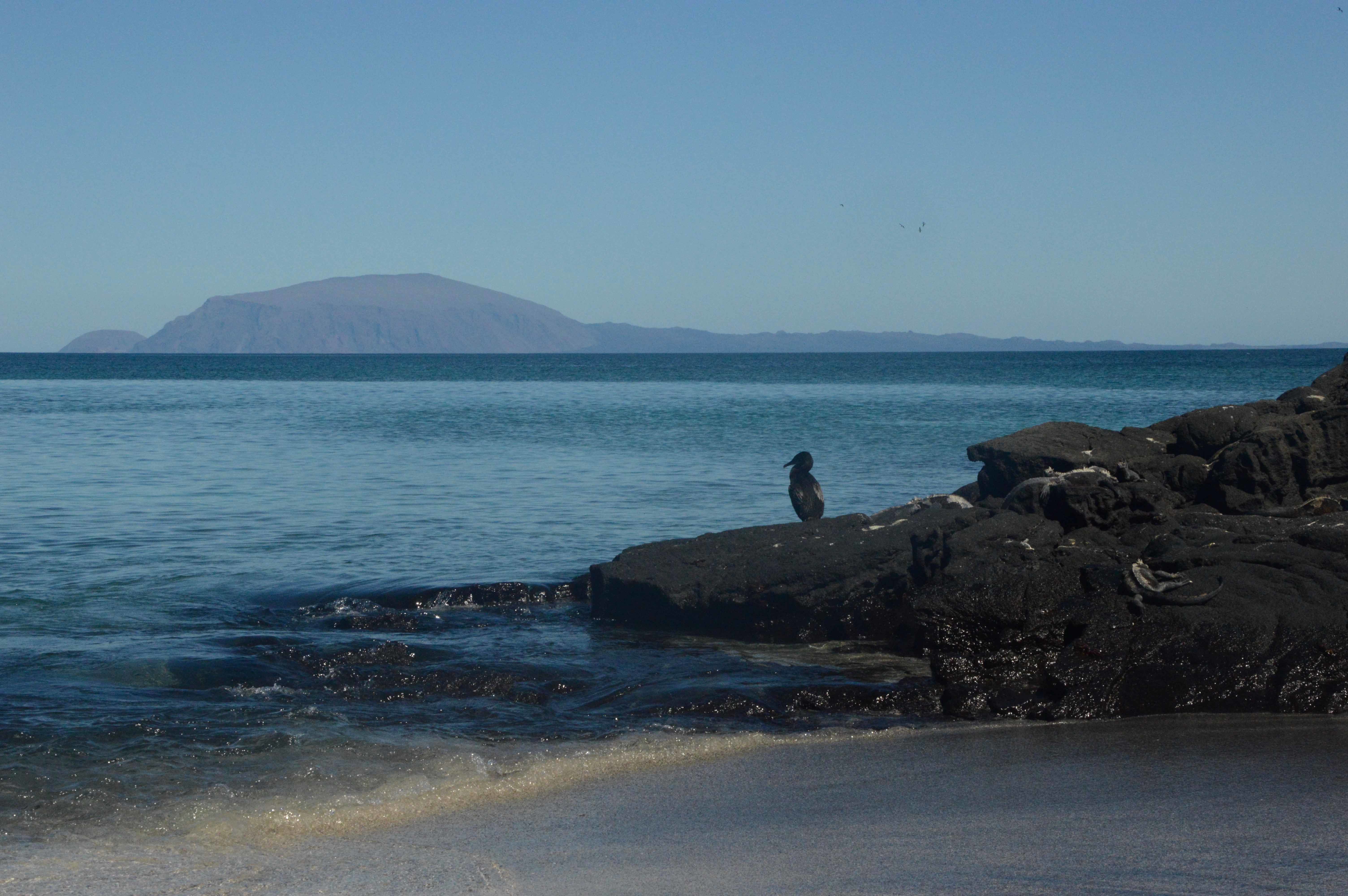 We woke up early in the morning as National Geographic Islander navigated along the northern part of Isabela Island. Slowly the sun appeared above the clouds surrounding Volcano Wolf. We spotted our first birds as Galapagos fur seals returned to shore from their night hunt. We enjoyed a great breakfast. Afterward, expedition leader Vanessa called everyone to the bow to celebrate as we crossed the equator. Our guests happily crossed the line. Approaching Punta Vicente Roca, the visitor site, we spotted Galapagos sea lions and a good number of ocean sunfish. The first activity of the day took place as we dropped anchor at Punta Vicente Roca. This is a spectacular geological site. The combination of the former volcano’s tall cliffs and the tuff cones formed later adds an amazing contrast to this unique visitor site. Our best tools for exploration, our Zodiacs, were lowered down, and off we went to explore the coast. We observed Nazca boobies and blue-footed boobies resting on the small ledges of the tuff cones. Galapagos sea lions swam close to our Zodiac, and Galapagos penguins rested on a broken piece of the tuff cone after feeding. What a wonderful sight! In a calm area, we found a good number of Pacific green sea turtles. The morning’s activities ended with snorkeling. Pacific green sea turtles, plenty of colorful fish, Galapagos marine iguanas and flightless cormorants surrounded us. It was a phenomenal experience! The ship was repositioned toward Fernandina Island. The youngest island of the archipelago, Fernandina is a highlight of our expedition. This island shows our guests the beginning of life. We observed animals thriving in the hostile environment. Pioneer plants like lava cacti grow on the lava fields, breaking down rocks little by little to create soil for the next generation of plants. Punta Espinoza is known for its huge colony of Galapagos marine iguanas. It is hard to distinguish the iguanas from rocks since they are so dark in color. On the other hand, colorful Sally Lightfoot crabs added contrast to the young, dark lava fields. We ended our walk as the sun was setting, returning to the ship with great memories. It was a fantastic day in the western part of the archipelago.