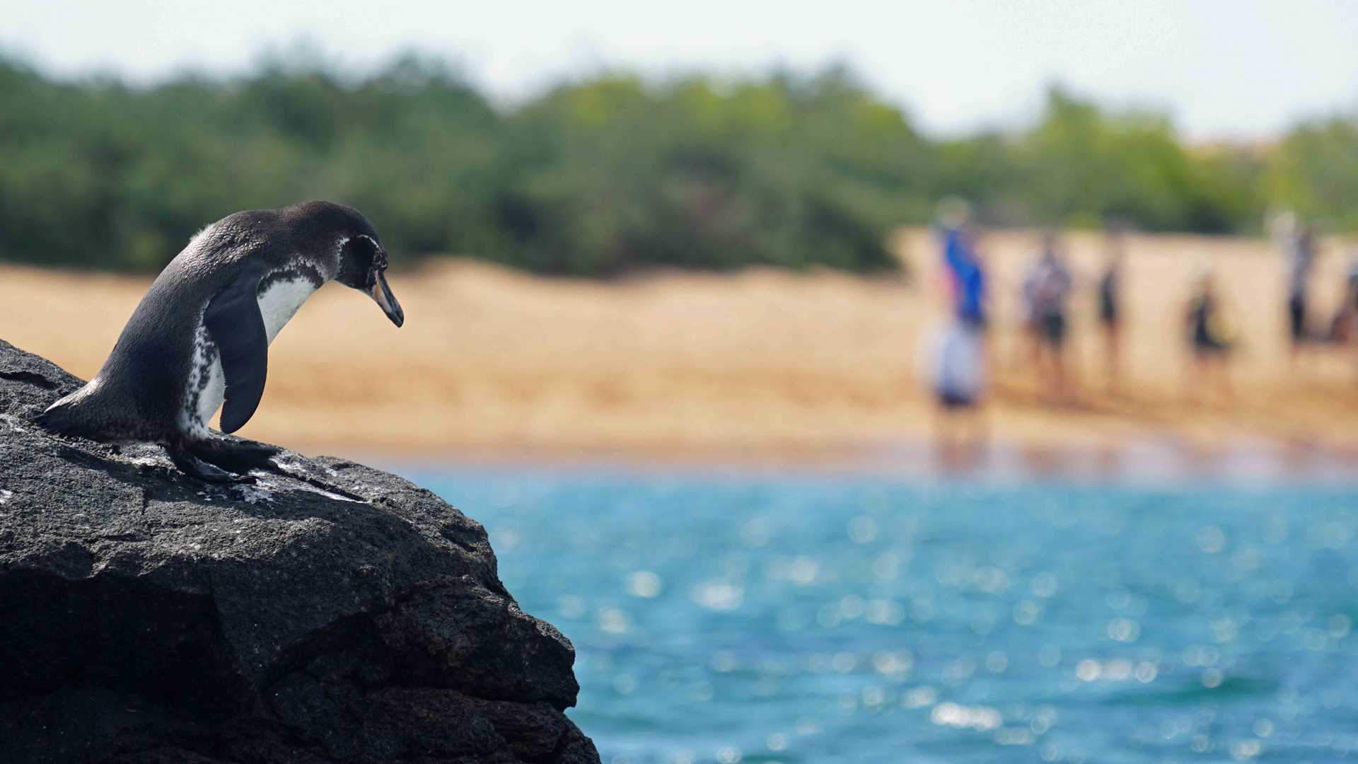 At around 3:00 p.m. we anchored close to Sombrero Chino and the Bainbridge Islets. These interesting, small volcanoes probably formed when the sea level was lower, as parasitic cones of Santiago or James Island. Soon we dropped anchor near Chinese Hat and went snorkeling off the coast of the young lava fields of Santiago Island. We had an incredible time in the water, followed by a Zodiac ride around the same snorkeling area, but this time to photograph Galapagos penguins and other shore birds with the golden light of the equatorial sunset.