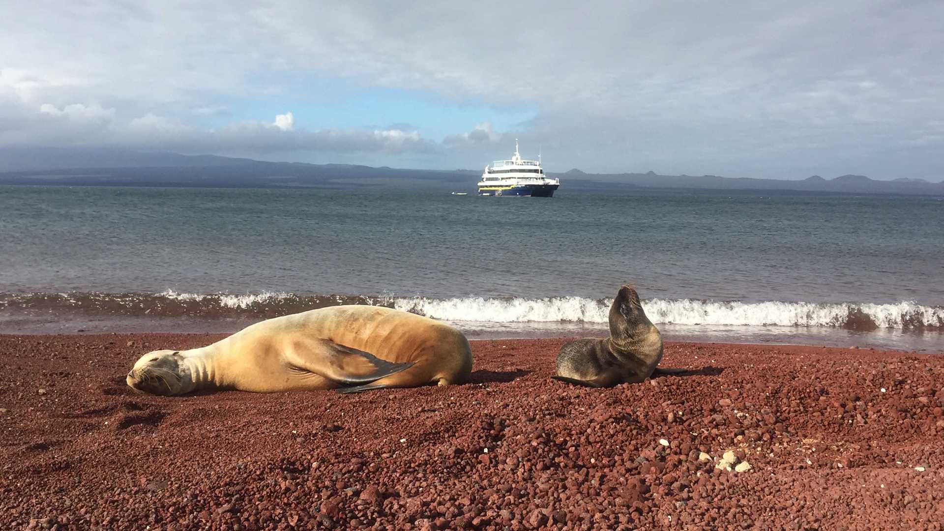 With the last sunrays, we found ourselves walking along a red sandy beach with a sleepy Galapagos sea lions. The light was golden, perfect for photographing sea lions and pelicans in full action. Minutes later, we moved behind the beach to observe different species of sea shore birds while on the trees some yellow warblers and vermilion fly catchers called the attention of our guests; it was late, the sunset looked spectacular and it was time to back aboard National Geographic Islander. Just before sunset, we headed back to the National Geographic Islander, observing the red beach and the sea lions that captivated us today forever.